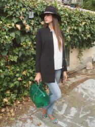 Flashback... Bonjour, bonjour, On commence la semaine avec un look rétro, comme je les aime :) Sinan je me fringuerai autrement me direz-vous, surtout que le pantalon à carreaux ne doit pas être du goût de tout le monde, vu le nombre de personnes qui m'ont regardé de travers hier! hi hi^^ Je dois dire que je me sens vraiment bien dans cette tenue, dans mon élément ;) Donc pour accompagner mon legging à carreaux, je porte un pull à manches courtes acheté il y a 5ans en soldes à Bershka, une veste de costume achetée en soldes cet été chez Zara, ma capeline h&M et mes escarpins favoris! J'adore la manière dont s'accorde les éléments de cette tenue,...