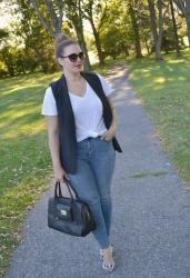 Rewear: High Waist Jeans Yep. They are back again. I wore these jeans for Monday's post but in a more comfy/casual way. I figured I would dress them up a bit just to show their versatility and how easy it is to take a pair of jeans like these from day to night, casual to dressy. I kept the shirt (and jeans, duh.) the same but swapped my plaid button up for this vest (that has been in my closet for at least a year!) and my sneakers for heels. I also knotted the shirt again to show off the high waistedness (I know that's not even a word, but I am making it one) of the jeans. After all, whats the point of wearing them if you can't even tell? I love being able to change something as...